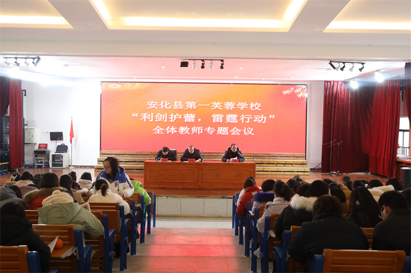本网讯 1月2日中午,安化县第一芙蓉学校召开“利剑护蕾·雷霆行动”专题会议,全体教职工参加。