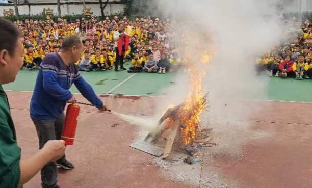 本网讯 11月8日,紫云完小举行以“预防为主,生命至上”为主题的消防演练。全体师生、食堂工作人员、保安参与演练。 演练从总指挥贺勇的消防知识讲解开始。他从火灾产生的原因、火灾类型、灭火器的选用、如何使用灭火器,讲到如果超出了个人可以控制的范围,第一时间拨打“119”,从火灾现场的逃生技巧。他讲得清楚全面,现场参与者无不侧耳倾听,时不时轻轻点头。讲解完毕,学生、教师、食堂工作人员、保安等选派代表上前演练灭火器的使用步骤。随即,生起一堆火,代表们演练灭火。演练完毕,安全主任陶光明与观看者互动点评灭火演练,同时对灭火器的使用要点、灭火时应注意的事项再一次强调。 据悉,该校一直重视师生员工的消防培训,此次消防演练将进一步强化师生的消防意识,巩固师生的消防灭火常识。