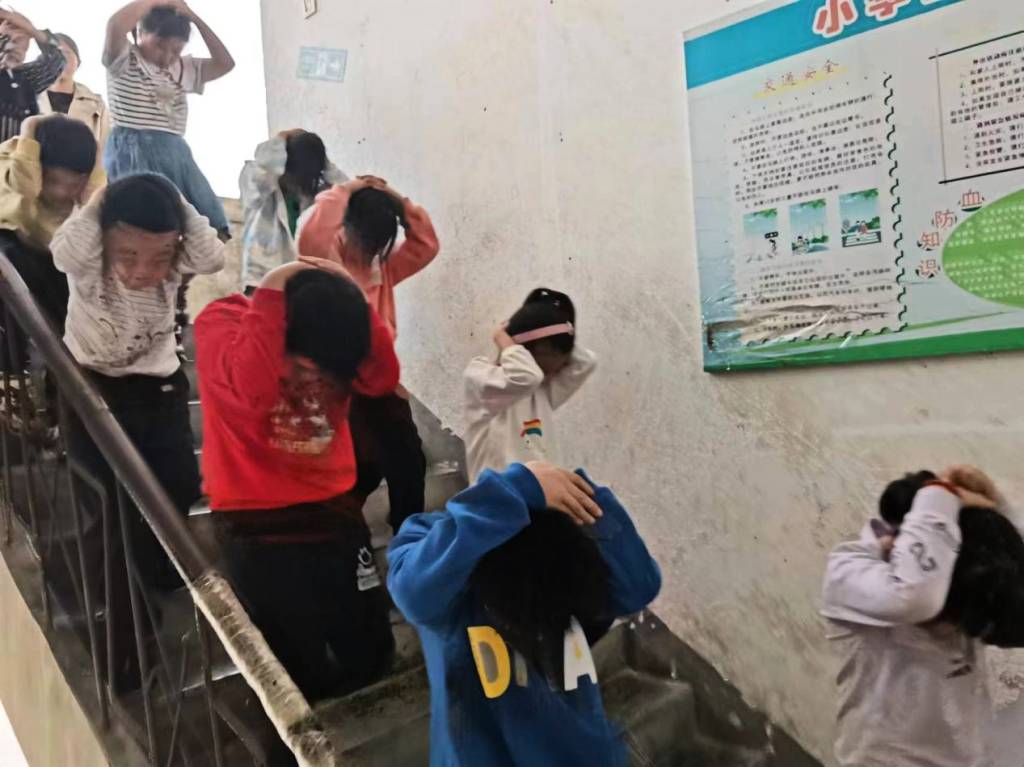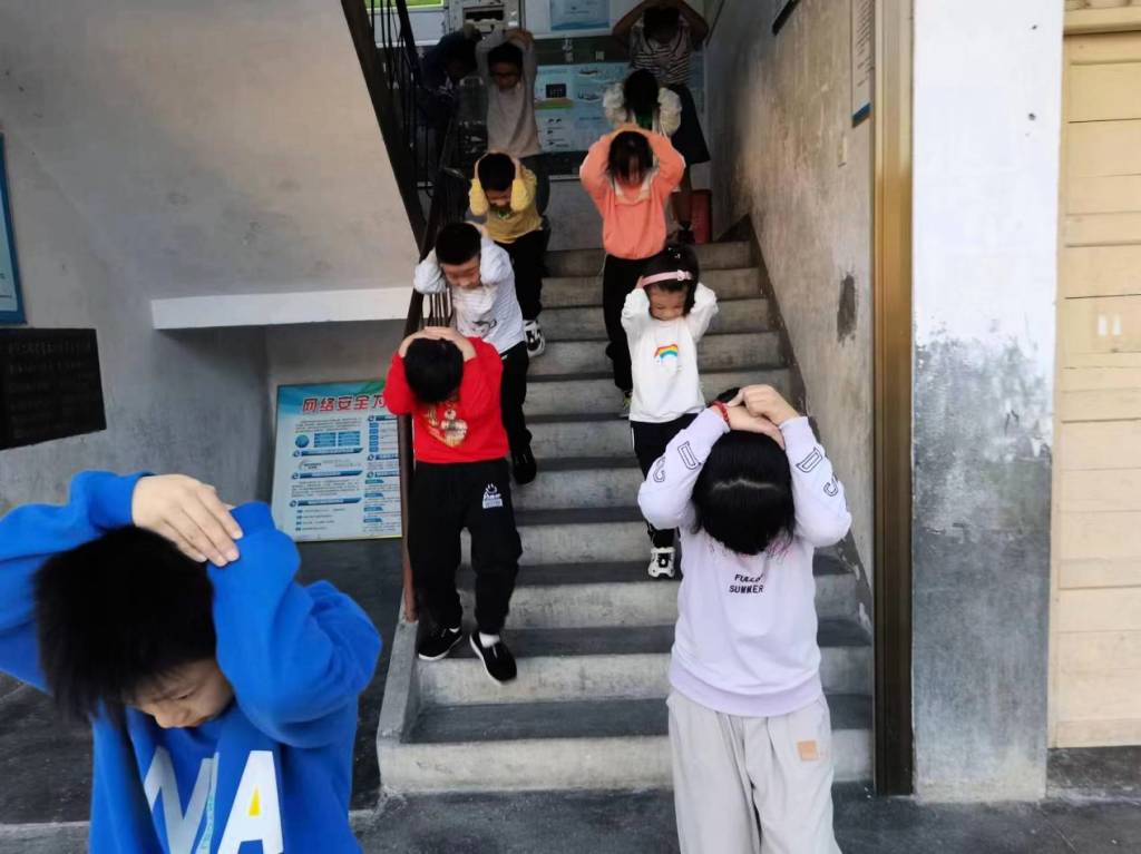 在急促的警报声中,正在上课的学生在班主任老师的指导下,用书包或双手护头,弓着腰,沿着楼梯,快速有序地撤离到学校操场的安全地带。整个疏散过程井然有序,动作迅速,学生不拥挤,不吵闹,不慌乱。