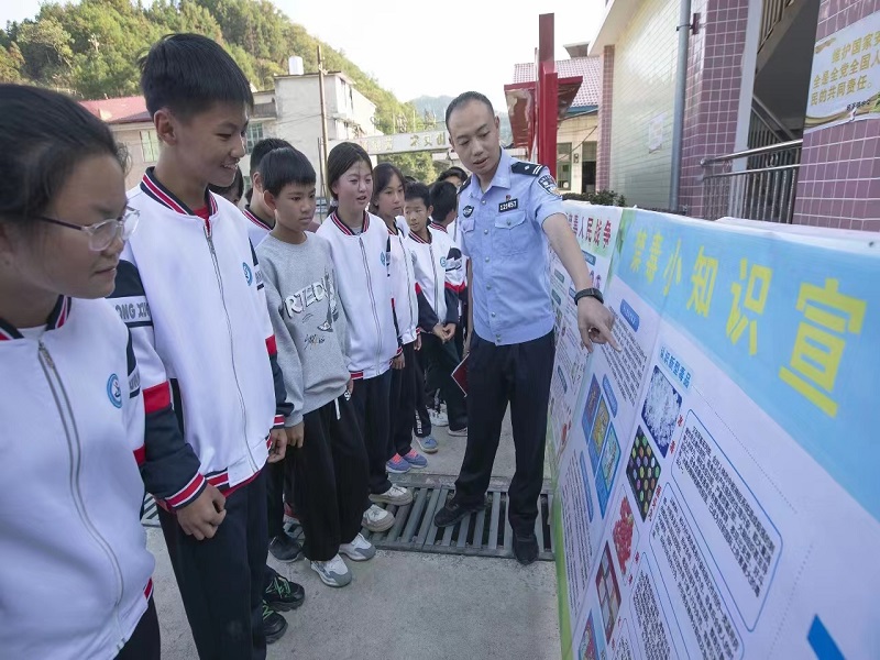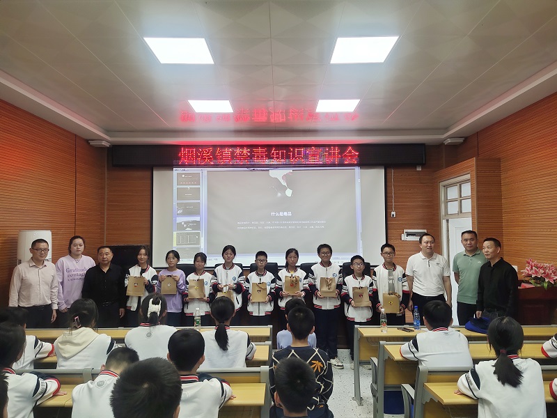 本网讯 10月16日下午,烟溪镇党委书记刘双爱、政法委员廖亚奇率领派出所、司法所、应急办、禁毒协会等有关单位到烟溪镇中学开展禁毒知识宣传教育活动。活动由烟溪镇中学校长杨洋主持,该校2023级七年级学生及教师参加本次活动。 本次活动分为现场禁毒常识宣传讲解和专题讲座两部分。烟溪镇派出所所长王达凯在操场上随学生们参观禁毒常识展板,并生动解读禁毒宣传展板所示内容,全体同学认真聆听,仔细感悟,表现出了强烈的求知欲。 在报告厅,主持人杨洋介绍完出席活动的领导后,廖亚奇从我国目前禁毒的形势进行详细讲解,并号召同学们要从自身做起,树立正确的世界观、人生观和价值观,养成良好的生活和行为习惯,远离毒品、拒绝毒品,拒交不良朋友,拒往不当场所,筑牢青春无毒的思想防线。 本次禁毒知识教育宣讲,主讲人是司法所胡丹霞向师生们宣讲禁毒知识。胡丹霞就当下毒品的种类、危害、防范毒品的意义和如何防范毒品侵害等几个方面,向同学们生动、详实地讲述禁毒的相关知识。在整个宣讲过程中,同学们听得认真,互动热烈。随后,胡丹霞组织同学们通过问答的方式,回顾学到的禁毒知识,现场气氛活跃,同学们热情高涨,积极主动举手回答问题,并为答对的同学们送上精美的小礼品,让同学们在轻松愉快的氛围中学习到了更多的禁毒知识。 通过本次讲座,同学们切实将禁毒知识牢记心中,有效增强了学生自我防范能力,筑牢校园“防毒墙”,让“珍爱生命,拒绝毒品”的理念深入学生们心中,远离毒品的侵害,共同营造安全、健康的校园。