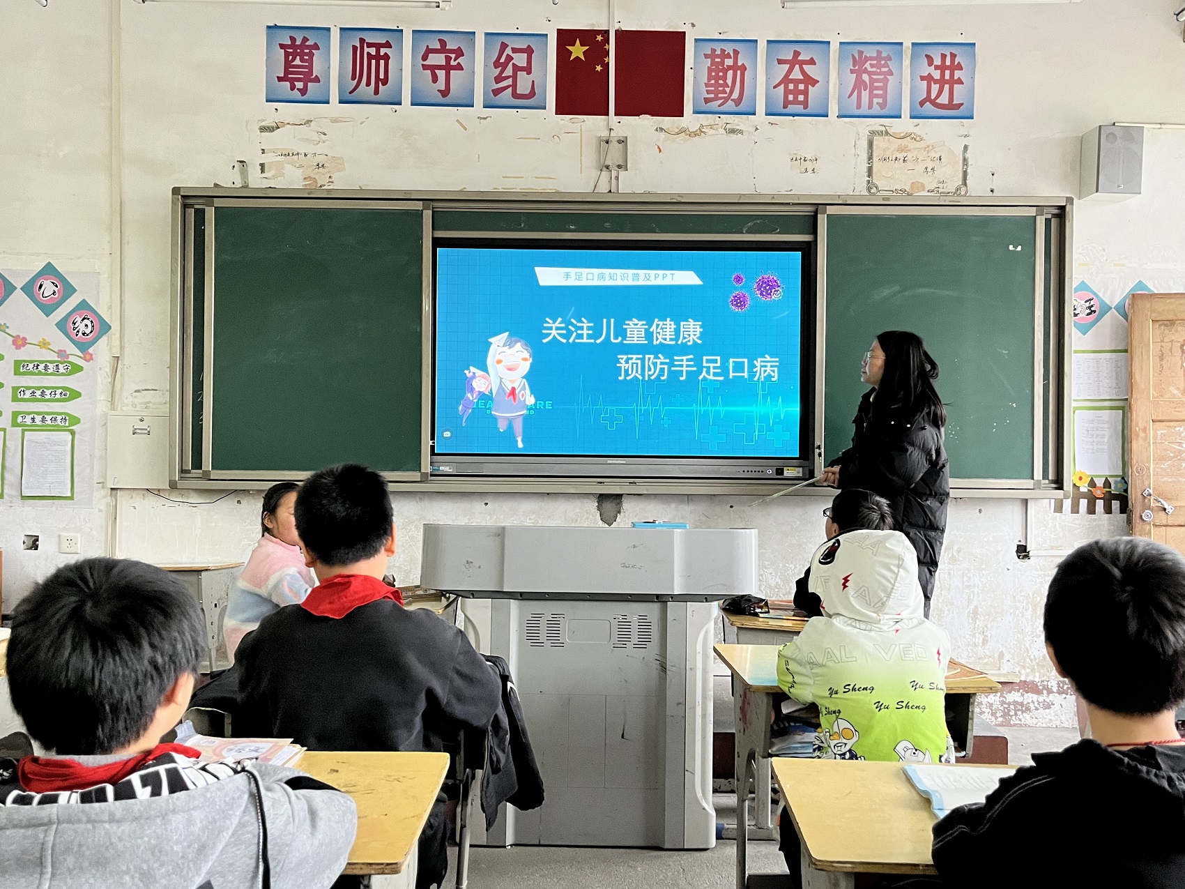 班会上,各班班主任通过讲理论、举事例、看图片等形式,深入浅出地讲授了手足口病的病原体特点、传播途径、临床表现及预防措施等内容。同时对学生个人卫生进行检查,教育学生注意保持教室环境空气的流通;养成良好卫生习惯,做到勤洗手、勤剪指甲、勤换衣物、勤晒被褥;加强体育锻炼,增强免疫力;合理饮食,平时多喝水,多吃新鲜水果和蔬菜等。