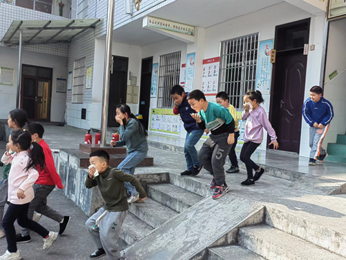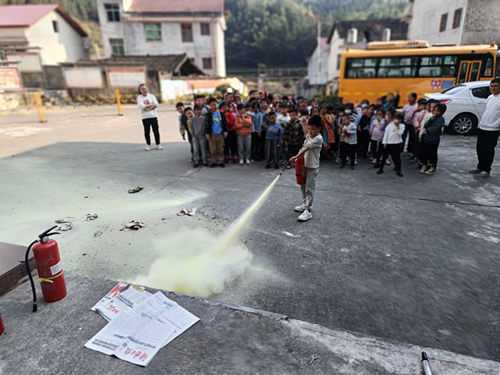 下午3点整,随着一阵急促的警报声响起,田庄乡田庄小学各楼层负责老师立即到达各自位置,指导楼内学生快速疏散。整个撤离过程,师生捂住口鼻、弯腰低头、步伐稳健,无嬉戏喧哗、无拥挤推搡,快速、安全、有序疏散到了操场。校长谌波现场演示了使用灭火器灭火,还让学生进行了操作体验。