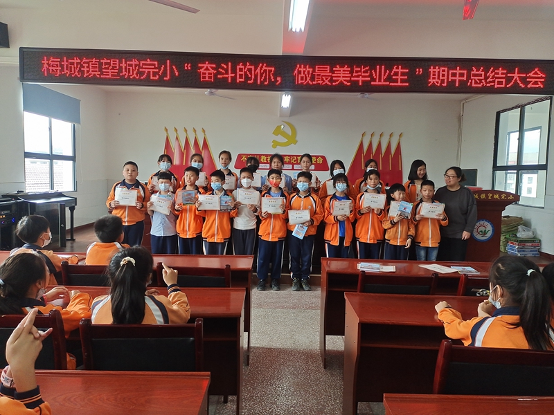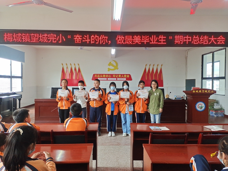 本网讯 忙碌而又充实的半个学期已经走过,期中质量检测已经落下来帷幕。日前,梅城镇望城完小举行了“奋斗的你,做最美毕业生”期中总结大会。 会上,14班学生刘茜就如何提高学习效率介绍了自己的经验与方法。教导主任董鸿亮指出:期中质量检测既是对同学们半学期以来学习成绩的检测,也是老师工作成绩的见证。对于取得好的成绩不能沾沾自喜,提醒老师和同学们要戒骄戒躁,不弃不馁,以优秀学生为榜样,平时注重培优补差工作,争取在下一阶段的学习和工作中取得重大突破。他分析了当前同学们学习方面存在的主要问题,并给出了切实可行的建议。对毕业生提出了“坚持做好细节,成功水到渠成”的八条建议,鼓励学生珍惜时光,扎实学习,做一个有目标、重行动的人。 校长李兴家要求全体同学以获奖的同学为榜样,力争在下次考试中能实现自己预定的目标,将“有志者,事竟成,破釜沉舟,百二秦关终属楚;苦心人,天不负,卧薪尝胆,三千越甲可吞吴!”送给全体毕业班学生。就小学最后几十天的学习与生活提了几点希望:要学会感恩,要有进取拼搏精神,要将老师布置的作业彻底落实,要养成良好的行为习惯。 最后毕业班班主任为本次质量检测中成绩优异的学生现场颁奖。(通讯员 李咏如)