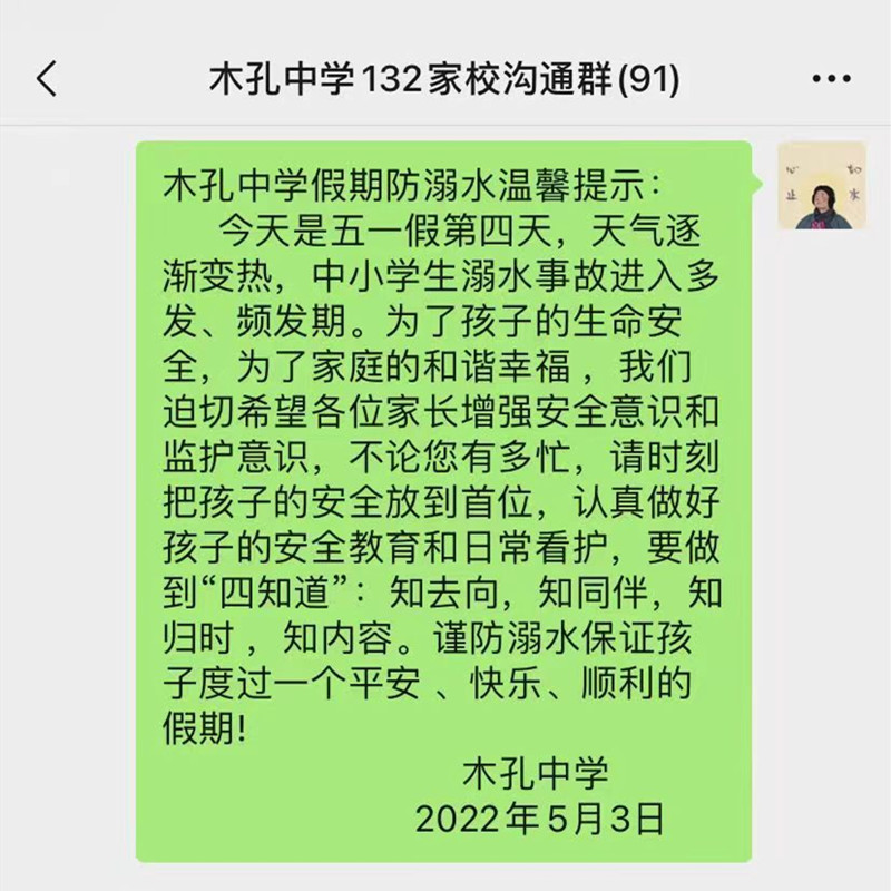 本网讯 5月5日上午8:30,大福镇木孔中学召开了第十一周行政例会,会议由校长刘辉主持,所有管理人员参加。 会议上刘辉逐一检查了五一假期防溺水温馨提示、学生每天报平安、防溺水宣传海报张贴、河道巡视等影像资料,总结了五一放假前防溺水的工作安排,对各行政人员、班主任放假不放工作给予了肯定,同时指出,各班级要利用各种渠道宣传防溺水知识,进一步增强家长安全意识和监护意识,做好学生在家的安全教育和日常看护,在学校要通过对学生实施防溺水安全教育活动,培养学生安全常识,提高学生自救、自护能力,做到充分发挥联动效能,齐抓共管,方能防患未然,为学生营造了一个“健康、和谐、安全”的成长环境。 据了解,该校假期河道巡视历来就有传统,多年来零溺水事故,得到了村委会、家长们的一致好评,也为学生的生命安全构筑了坚实的防线。(通讯员:刘志平)