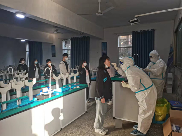 本网讯 疫情就是命令,防控就是责任。4月7日上午,滔溪镇中学会同滔溪镇卫生院组织开展全校师生员工核酸检测,对师生健康状况进行一次全面排查,进一步织牢疫情防护网。 检测前,学校按照防控要求制订了全员核酸检测工作方案,对全校师生职工进行分组安排,提出相应要求,各班收集好学生身份证。 学生们在班主任老师的指引下,有序地按照年级班别依次进行核酸检测。学生们前后间隔一米,全程佩戴口罩,站队整齐,排列有序,检测完毕,立即按照指定路线回到班级。滔溪镇卫生院派出14名医护人员,组成 4个核酸采样组。检测过程中,医务人员严格按照采样流程,落实个人防控要求,依次进行采样,共计采样600余份。整个检测过程有序、规范。(通讯员 李祥明)