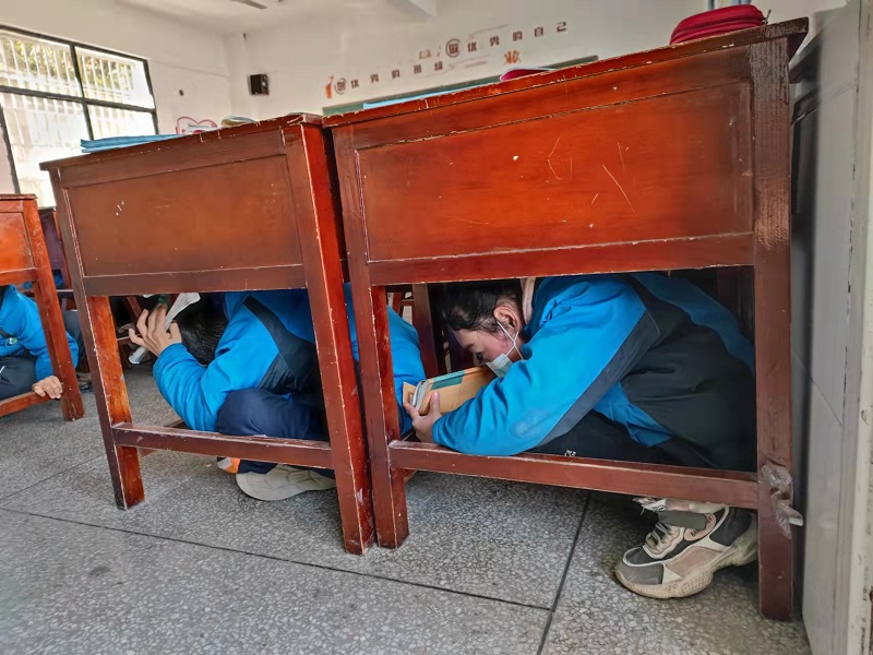 随后开展了防震安全疏散演练,听到警报声后,各班老师立即告知学生“地震了,不要慌”,指挥学生紧急避险,双手护头,蹲在桌子下或者教室承重墙角落等,震点一过就有序、快速出教室到达指定安全地点。