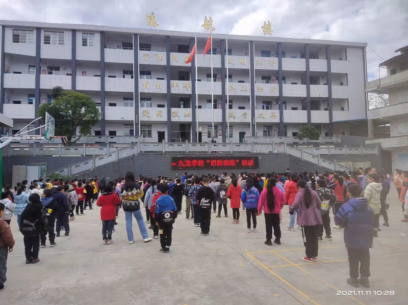 本网讯 11月11日上午,九龙学校举行了消防安全应急疏散演练活动。 上午10时35分,随着警报的响起,各班班主任老师迅速到达各班协助上课老师一起组织学生疏散,值班老师也在第一时间赶到自己当时所在楼层拐角处配合疏散学生。各班学生在老师们的指挥下,弯着腰,猫着步,用手帕、毛巾等捂住口鼻,沿着学校指定楼梯口快速前进,有序撤离到学校操场的安全地带,耗时1分25秒。随着各班班主任清点人数,并层层上报,全校300多名师生全部安全疏散完毕;随后,安化县消防救援大队的邓教员给全体师生详细讲解了灭火器的使用方法,并现场进行了演示,同时邀请了部分教师和学生上台体验使用灭火器灭火的过程。