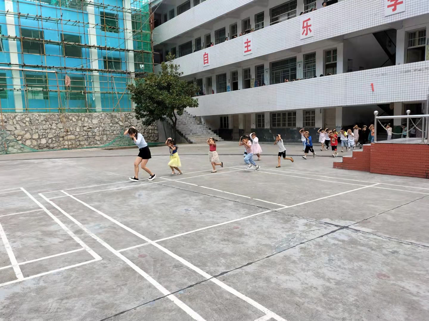 本网讯 9月16日上午,木榴完小开展消防安全疏散演练活动。上午10点10分,校园内警报声突然响起,各位老师到达指定岗位,引导楼内学生快速疏散,各班主任带领学生弯着腰、猫着步,用衣角等捂住口鼻,沿着学校指定路线快速前行,有序撤离到操场的安全位置,通过此次演练活动,强化了师生的安全意识,更进一步提高了师生的应急疏散能力,为巩固“平安校园”“按全文明校园”的成果而不懈努力。(通讯员 龚高谦)