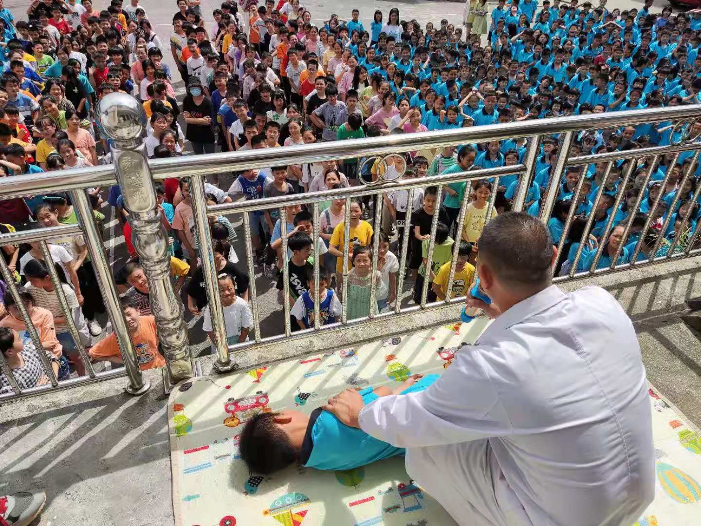 木孔知名聂医生给大家详细讲解学生心肺复苏演练。要来是让患者倒立,排出腹腔积水;采取胸腔按压法,(并采取“剪刀石头布”的趣味性传授);侧卧,排出口腔异物;人工呼吸法。
