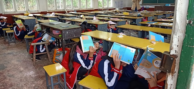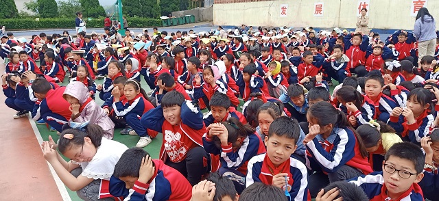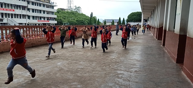 随着一阵急促的防空警报铃声响起,全校师生按照“防震应急疏散演练预案”进行演练。整个过程秩序井然,同学们在老师的指导下,迅速躲到桌子下,双手用书本护着头部迅速进行安全撤离,两分钟时间,全校师生安全撤离到指定的操场位置,达到了预期效果。
