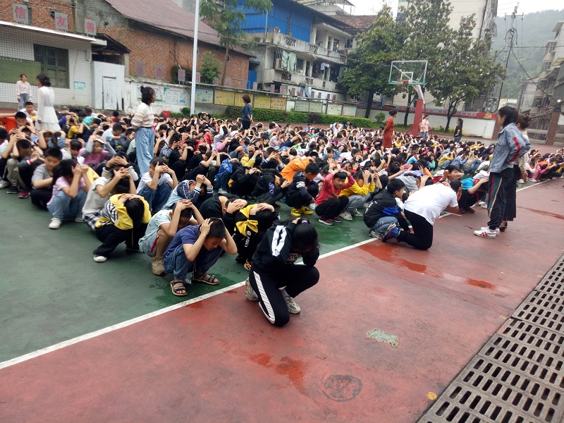中午13时22分,随着警报声响起,防震疏散演练正式开始。教室里,学生护住头部,藏身于课桌下面。随后,同学们在各楼层负责教师的组织下,按照既定的疏散路线,沿着楼梯快速从教室向安全场地集合。班主任老师随即整队、清点人数,全校学生无一人掉队,全部到达指定安全位置。