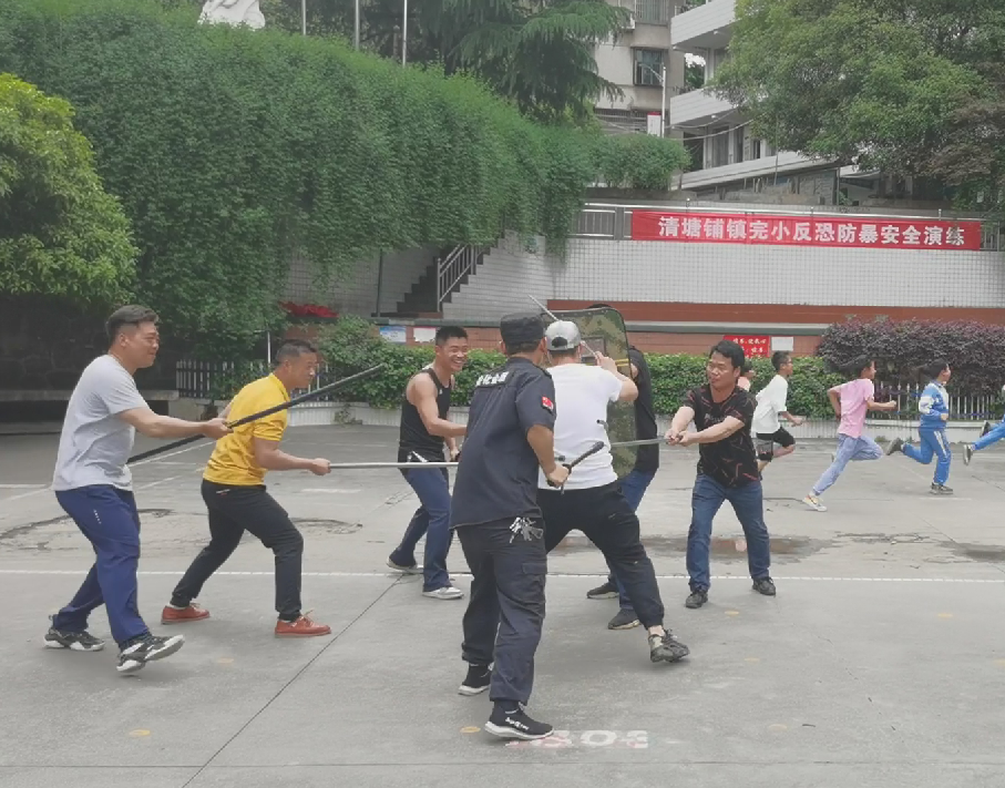 本网讯 5月10日上午,一名携带刀具的不速之客以探视学生为由欲强行进入校园,保安、护校队迅速出动,奋力拼搏与其周旋,成功阻止事态的扩大。清塘铺镇完小上演了惊心动魄的一幕,实为我校开展的反恐防暴安全演练活动。 为了有效防范突发伤害事件,切实保障师生人身安全,及时处置侵犯师生安全的恶性事件,维护该校安全稳定,増强在真实情景下的心理素质和反恐防暴意识,提高师生应对能力。学校组织开展防暴反恐模拟安全演练活动。 活动前,安全专干熊峥嵘老师就本次演练做了具体的部署,要求全体安保人员和护校队成员参与,熟悉对防暴盾、 警棍等专业工具的使用,加强安全技能培训,提升安保技能水平。 活动开始,保安人员和护校队是学校的第一道防线,第一时间围追持械歹徒。同时校园警报声响起,各班迅速做出反应,指挥在操场活动的学生疏散撤离,组织学生关紧门窗,就地隐蔽,时刻保持警惕。学校保安人员和应急小分队将“歹徒”成功控制并带离现场。 最后,熊峥嵘老师通过广播告诉同学们:假如暴力恐怖事件发生在我们周围,同学们要牢记应急逃生技能“五字诀”:逃、藏、告、挡、踹。 通过此次防暴演练活动增强了我校全体师生的安全意识和防恐防爆意识,特别是提高了学校门卫、值班人员、护校队在反恐防暴突发事件中的处置应对能力,掌握了险情发生后的逃生自救能力。今后,我校将坚持“着眼事发,止于未发”的原则,继续开展落实好学校反恐防暴系列活动,为全体师生提供更加安全放心的工作学习环境! (通讯员:龙艳萍) |