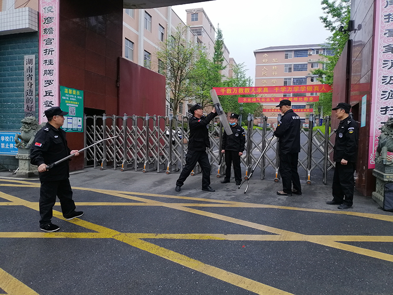 本次演练包括队形队列演练、校园排查演练以及校园防暴演练三个部分。全体保安、门卫人员参与演练,该校安全副校长姚喜临、安全专干孙柏林负责本次活动的开展。在校门口持刀歹徒(由保安扮演)突然出现,情绪异常激动之时,为保学校师生安全,姚校长发布紧急命令,立即启动《防暴应急预案》,保安门卫全体成员按防暴应急预案手持盾牌、钢叉胶木棒等器械,将“歹徒”围住,成功将歹徒迅速制服。