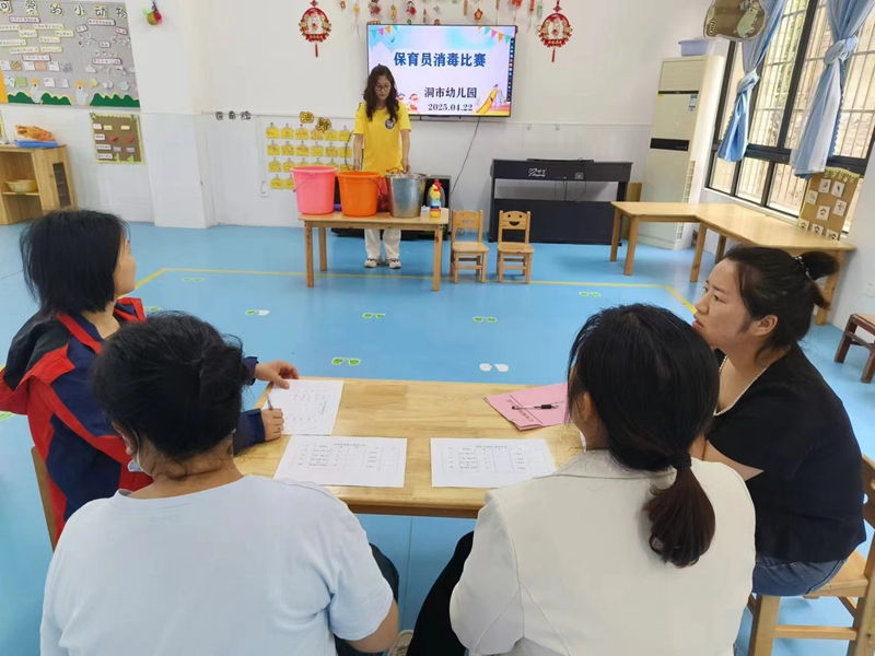 本网讯 4月22日,洞市幼儿园后勤主任邱淑琴组织该园保育老师开展了以“科学消毒,‘净’护童心”为主题的消毒技能比赛。
