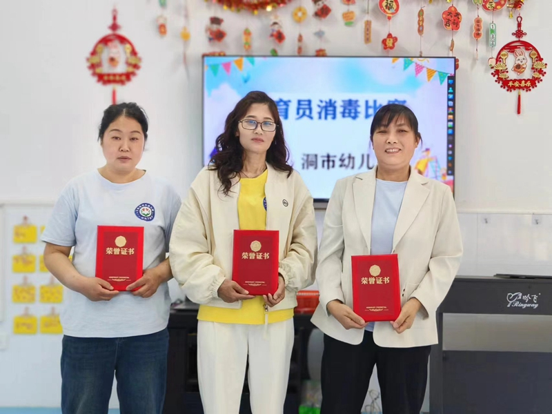 桌面、毛巾、玩具 等不同场景的消毒要求,参赛教师沉着应对:手持量杯精准量取消毒原液,按照科学配比缓缓注入清水中,每一步操作都严谨规范。比赛现场气氛虽然紧张但是井然有序,保育员们动作娴熟,个个操作规范,细致认真,每一个环节都一丝不苟,充分展示专业的消毒技能,活动最后该园负责人给予了老师们专业的中肯评价和技能的肯定,并为比赛中优胜的选手颁发荣誉证书。