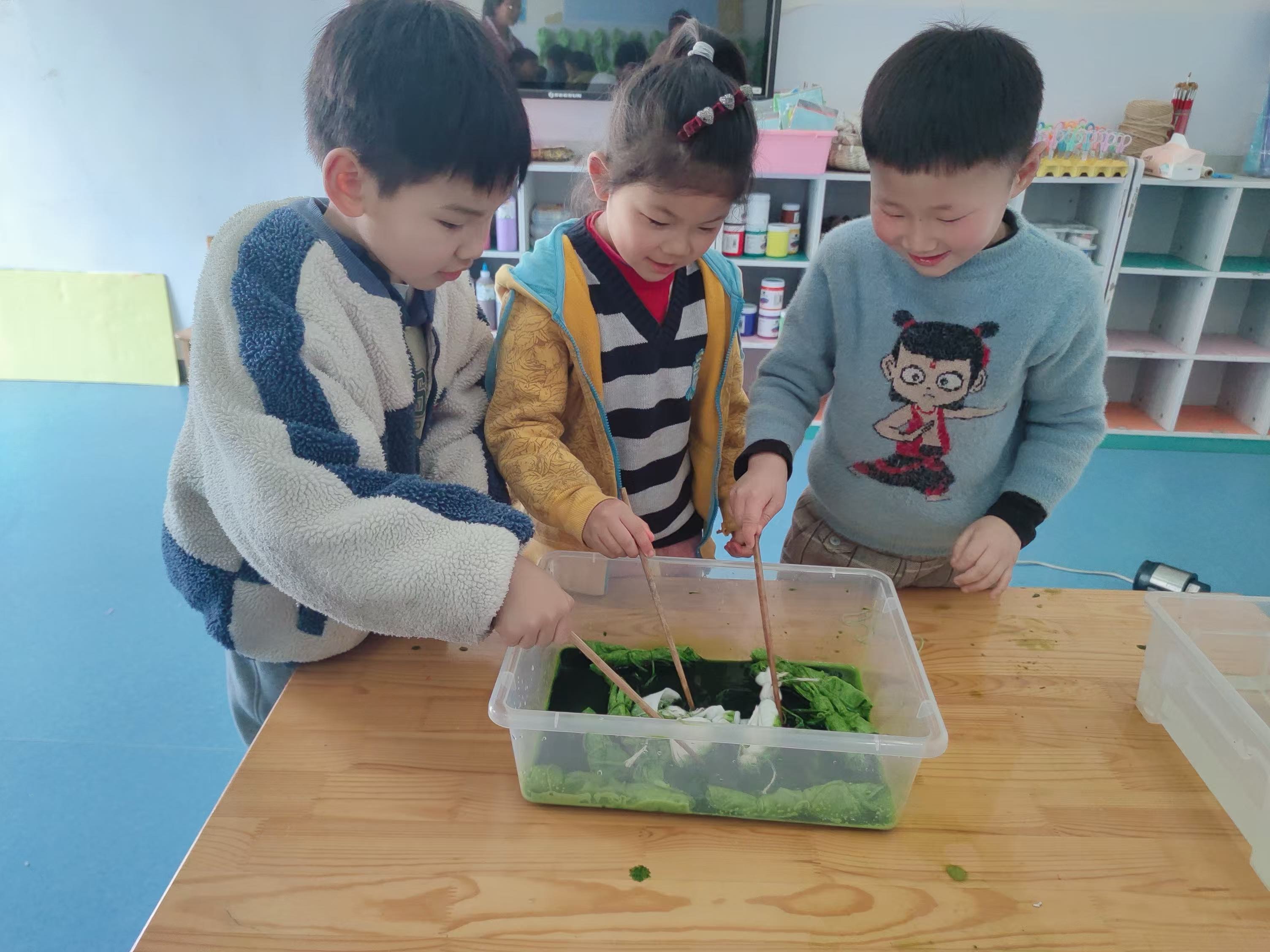 大班的活动现场则是一片色彩的海洋,小朋友们正专注于用蔬菜汁进行扎染创作。他们认真地折叠、捆扎布料,再小心翼翼地浸入染缸,每一块布料都承载着孩子们的奇思妙想。