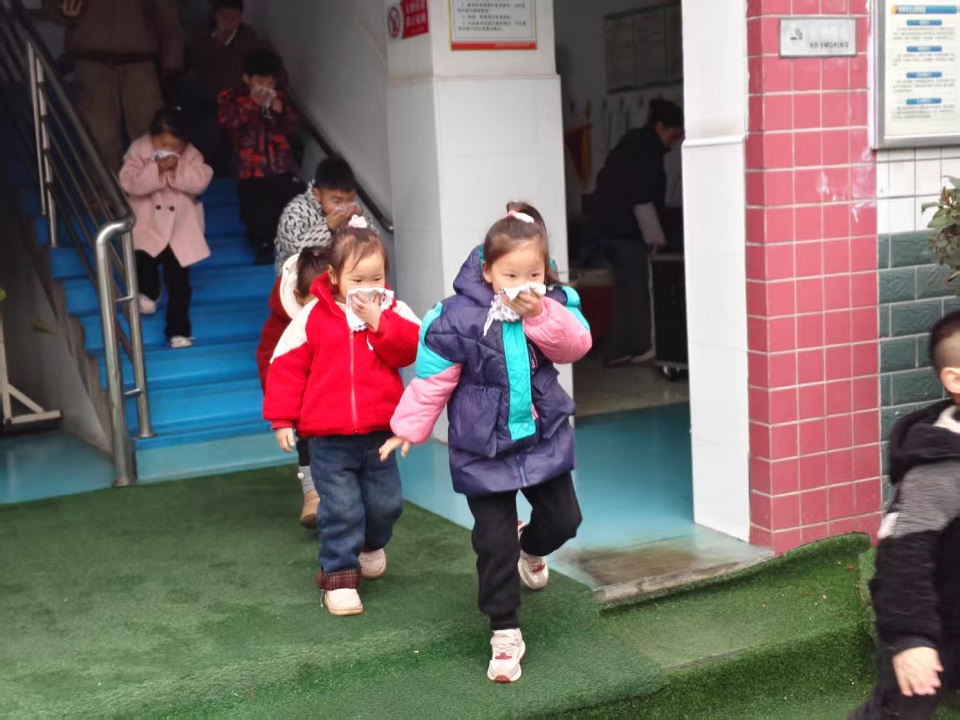 随着警报声响起,消防演练正式开始。孩子们在教师的带领下,用湿毛巾捂住口鼻,弯腰低姿,迅速而有序地按照预定逃生路线撤离到安全区域。整个撤离过程紧张有序,师生配合默契,仅用了2分32秒,全体人员就安全集结完毕。