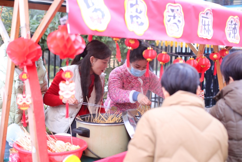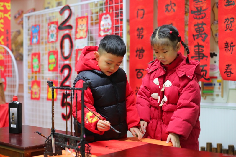随着欢庆的音乐响起,幼儿园内到处洋溢着浓厚的节日氛围,五彩斑斓的灯笼、红彤彤的窗花、喜庆的对联,每一处细节都透露着新年的气息。小朋友身着节日盛装,脸上洋溢着幸福的笑容,与家长们一同漫步在这充满欢声笑语的庙会现场。班级游戏区域热闹非凡,有“抬福娃”“挑灯笼”“套福接乐”等趣味十足的游戏,大家体验着不同游戏带来的快乐,亲子之间的互动也成为活动中一道温馨的画面。庙会也是此次活动的亮点之一,家长和幼儿通过参与游戏收集印章来兑换美食,一串酸酸甜甜的冰糖葫芦、一碗热气腾腾的关东煮、酥脆美味的手工饼干、垂涎欲滴的贺年糖果......大家兴奋的穿梭在各式各样的摊位之间,共享着美好“食”光,感受新年的热闹与喜悦。特别值得一提的是写福字环节,家长托着孩子的小手,在红纸上一笔一画认真写下福字,寓意福气满满。