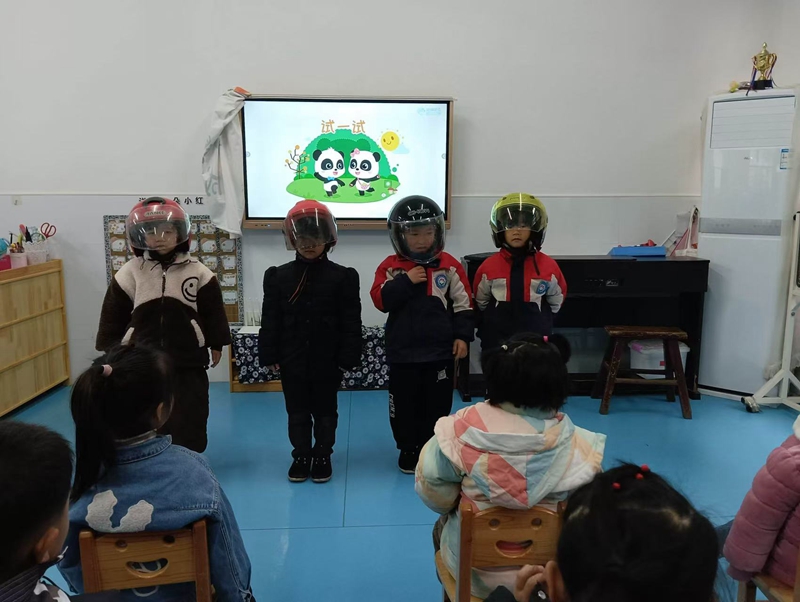 活动中,老师们通过精美的图、生动儿歌、有趣游戏、佩戴头盔和不佩戴头盔模拟实验,向幼儿们讲解了头盔的结构,佩戴头盔的方法,孩子们亲身体验佩戴头盔的正确步骤。使孩子们懂得了佩戴头盔和不佩戴头盔意外发生时的巨大差别,更深刻认识到了小头盔所承载的大安全。