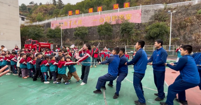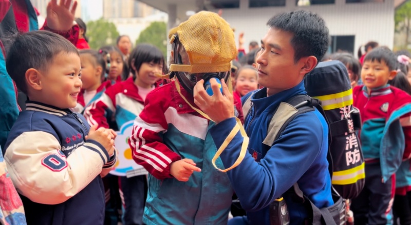 活动现场,消防员与孩子们积极互动,通过一系列关于消防安全的问答,激发了幼儿的学习热情,小朋友们还亲身体验了穿戴消防服、佩戴防烟面罩等的过程,感受消防救援人员在灭火救援时的装备重量和不易,每一项装备都让孩子们大开眼界,对消防安全知识有了更加直观和深入的了解。试穿消防战斗服、戴消防头盔......小朋友们争先恐后地也亲身体验了一把“小小消防员”的角色。最目不转睛的还是观看消防员日常救援训练环节,消防员们矫健的身姿、熟练的动作,赢得了孩子们的阵阵掌声和欢呼声。随后,一场精彩激烈的拔河比赛,小朋友们浑身解数“险胜”两场,现场气氛十分热烈而有趣。