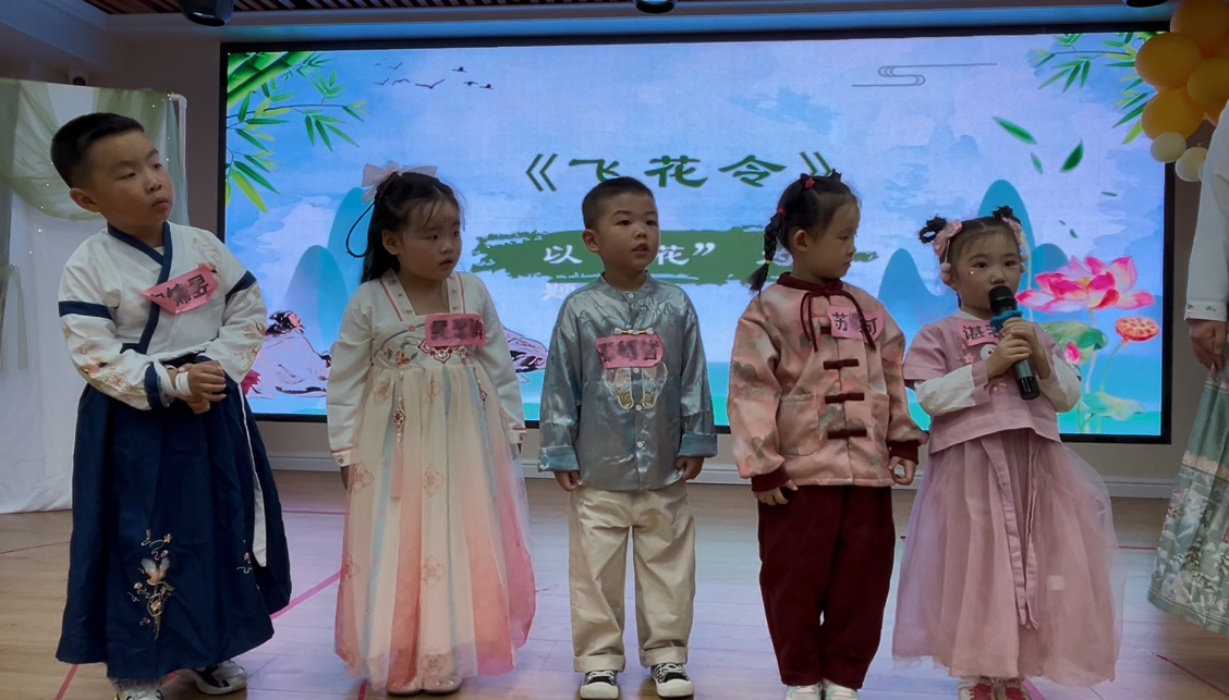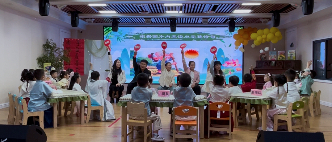一首《登鹳雀楼》化作动听的音乐和现代舞拉开活动的序幕,每一位小选手们身着汉服准备“大显身手”。本次比赛形式多样,无一不考验着小选手的诗词积累和应变能力。第一关“团队风采”引用诗人和诗词进行队名口号展示;第二关“诗词朗诵”用饱满的热情诵读诗句,尽显幼儿的卓越风采;第三关“诗词接龙”提升幼儿的语言表达能力和记忆力;第四关“你说我猜”巩固诗词名称及作者;第五关“知识问答”,一是通过图片回答相应诗句,二是通过选择题考察幼儿对诗词知识的了解;其中,第六关“飞花令”考验了小选手们的诗词积累量,再加上亲友团的鼎力相助,队员之间相互配合,每队表现都精彩绝伦,获得了阵阵热烈的掌声。