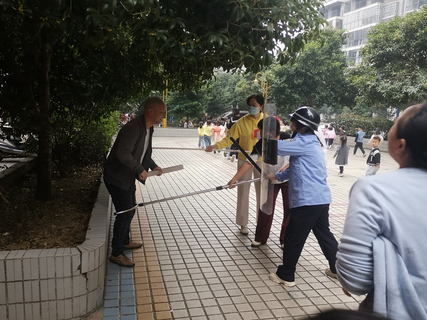 本网讯 10月12日,东坪镇泥埠桥幼儿园在户外操场开展了一场反恐防暴演练活动。 上午10:00,正当孩子们户外活动时,三名“歹徒” 欲强行闯入幼儿园,门卫保安及时制止并拉响报警。该园第一时间响起了警报声,各班教师按照预定的路线迅速指挥幼儿跑进活动室,躲进安全的地方。与此同时,幼儿园应急小队紧急行动,按防暴应急预案手持棍棒、钢叉等,将“歹徒”围住,临危不乱,与"歹徒”交涉、周旋,设法牵制“歹徒”,竭力保护全园师生安全。该园防暴组成员立即开展工作,大家配合制服“歹徒",并将“歹徒”带离现场。 演练结束后,各班教师对幼儿进行了心理疏导。此次反恐防暴演练活动,不但提高了门卫的安保能力,更增强了幼儿的自我保护意识、教师们的防暴意识与处理突发事件的应变能力。 初审初校:谌瑶 复审复校:吉龙慧 终审终校:王满君