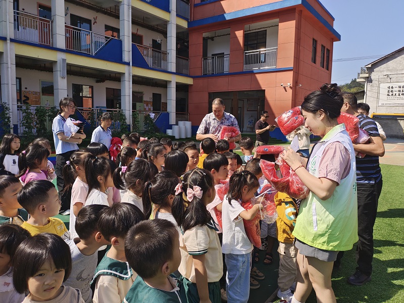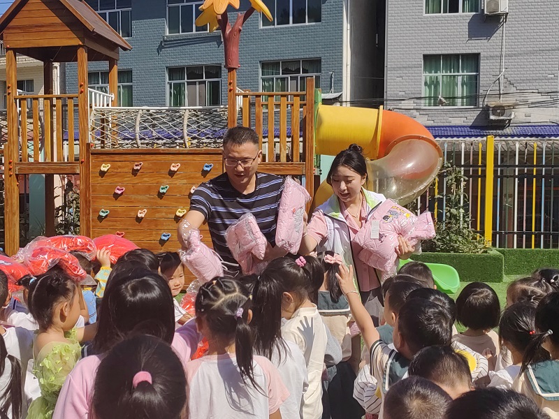 9月23日,田庄乡政府梁勇军带领社会综合服务中心及社工站成员为田庄乡中心幼儿园的小朋友送来了秋冬的第一件羽绒棉马甲,孩子们喜笑颜开。