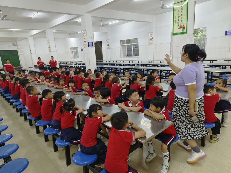 本网讯 6月17日,洞市幼儿园大班的小朋友们怀着对小学的好奇与憧憬,在老师的带领下参观了洞市完小,与小学有了一次零距离的接触。 天空虽然淅淅沥沥飘着小雨,却丝毫不影响孩子们探秘小学的热情,孩子们排着整齐的队伍,怀揣着好奇心和小期待,在老师们的陪伴下出发啦。首先来到了小学的第一站——食堂,孩子们观看食堂各个角落后,都不约而同地感叹道:这个食堂也太大了吧。紧接着孩子们有秩序地找到了小学的厕所,并进行了正确的如厕。 叮铃铃……上课时间到啦!在老师的带领下,孩子们走进了小学的教室,参观了教室的布置,体验了一番不一样的小学课堂,不一样的氛围和学习方式。整齐的书桌、笔直的坐姿、琅琅的读书声,孩子们感到兴奋又激动。课堂上,孩子们坐姿端正,聚精会神,一张张认真的小脸,俨然是一名真正的小学生。数学课上,老师通过找图形规律的教学,让孩子们发现、经历、探究图形和数字简单的排列规律,通过比较,从而理解并掌握找规律的方法,培养孩子初步的观察、操作、推理等能力,还感受到了学习的乐趣;另外一个班级的孩子则是在老师带领孩子们回顾了一些基础的汉字和词语,通过奖励过关卡的方式,让孩子们在一关一关的关卡解决过程中复习学过的内容,过关斩将的游戏中穿插了一些小学一年级语文课本中的重点词汇,让孩子们提前感受小学的学习氛围。