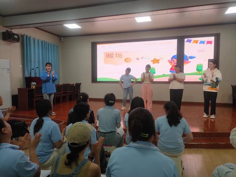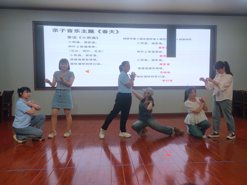 本网讯 5月11日,梅城镇幼教集团集团开展《亲子音乐活动的设计与实施》培训活动。 培训教师让老师们现场聆听《你好》音乐,分析音乐的结构,了解音乐的特点,采用跟同伴互动、空间移动、游戏结合三种方式让老师们知道用简单的音乐通过创新动作进行问好,来调动现场积极性和氛围,暖场环节作为进入主题音乐的过渡环节,需做到动静结合,稳定好情绪。 胡喜老师对主题音乐与再见这两个环节做详细讲解,她将词语节奏、固定型伴奏、填空式伴奏、创意动作这四种方式结合将《小雨滴》带领老师们进行花式表演,大部分老师都上台参与活动。整个培训现场氛围热烈,老师们积极互动,意犹未尽。 “这样的培训活动太有趣了,也非常实用!”中心园老师周慧珍发表感慨。