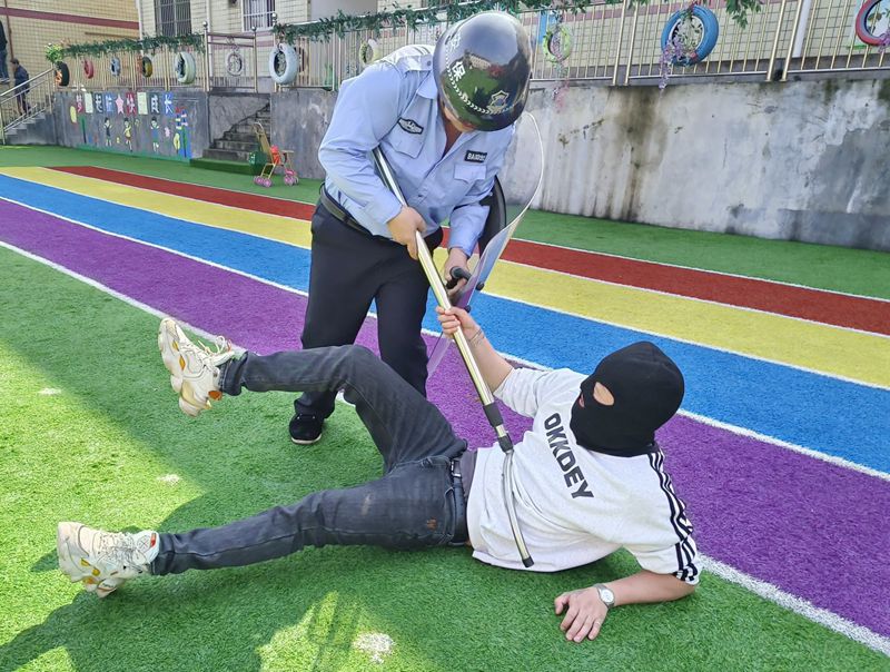 本网讯 “呜呜呜……”4月28日,洞市幼儿园门卫室传来了一键式报警器的紧急报警声,该园全体师幼正在进行反恐防暴演习。 演练活动中,由家长扮演的“暴徒”趁孩子们在户外做课间操时翻门入侵幼儿园。“暴徒”挟持一名幼儿无果后折返回来又挟持了一位老师,看到“暴徒”来势汹汹,保安人员立马进行制止,立马用钢叉、盾牌、警棍等防护器械进行防御,奋力阻止“暴徒”的行凶。争分夺秒间,“暴徒”最终被制服;事发过程无一人受伤,幼儿园宣布解除警报。 演练结束后,老师对孩子们进行了心理疏导,消除孩子们的紧张害怕情绪,保持乐观勇敢的心态,同时提高安全防范意识,察觉和防范身边的危险。