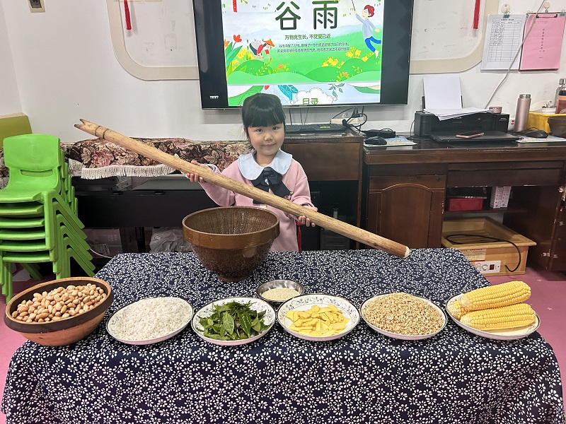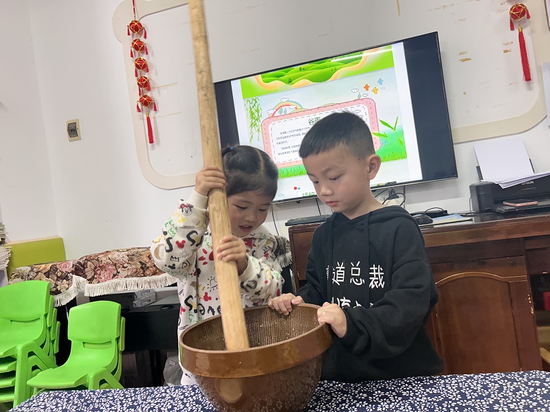 孩子们通过唱童谣、识原料、视频、亲手擂茶等方式,去感知“谷雨节气”民俗文化。小班幼儿在制作过程中学着清理茶叶,中大班幼儿在老师的帮助下剥的剥花生、擂的擂茶、我扶着钵体、你拿着擂茶棒,上下左右不断搅动,既分工又合作,配合默契。