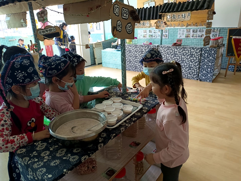 本网讯 4月8日,江南镇中心幼儿园“江幼擂茶”食育开展得有滋有味,小朋友们体验着打擂茶的乐趣,感受家乡美食文化的魅力。 打擂茶了,小朋友们戴上口罩,头巾和围兜,认真的忙活起来。首先,把生花生米放进擂钵里,用擂茶棒一下又一下捣碎。接着,又把熟花生米、生姜、茶叶也擂一擂,擂好后,老师将开水冲进擂钵,小朋友再搅一搅,撒上熟花生米和炒米,香喷喷的擂茶便出炉了。 “今天买擂茶送糖果,大家快来买哟。”小朋友在柜台前大声吆喝着。也有小朋友端着擂茶结伴去人多的地方叫卖:“好喝的擂茶一块钱一杯,还免费送糖果,再不买就没有了。” 据悉,该园通过多种特色食育的研讨和开展,尊重以“幼儿为主”的教育理念,多方的支持方式,丰富幼儿的直接经验和亲身感知。
