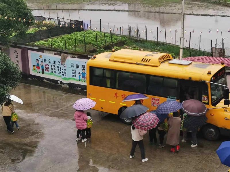每当下午的早上,孩子们入园的集中时间,园长、老师们不约而同地都做好了准备,只要有车有孩子的地方,就会有幼儿园老师撑着伞守护。