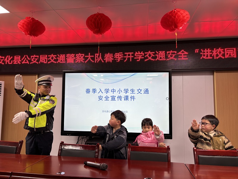 活动中,李鹏教小朋友做交警指挥手势操。孩子们兴致盎然,积极学习。“小朋友,伸左手,右手伸直斜向左下方。”“我学会了,我学会了。”会场一片欢呼。郭琼教小朋友认识马路标志、乘车安全注意事项等安全知识,并且组织小朋友们观看了警示片。