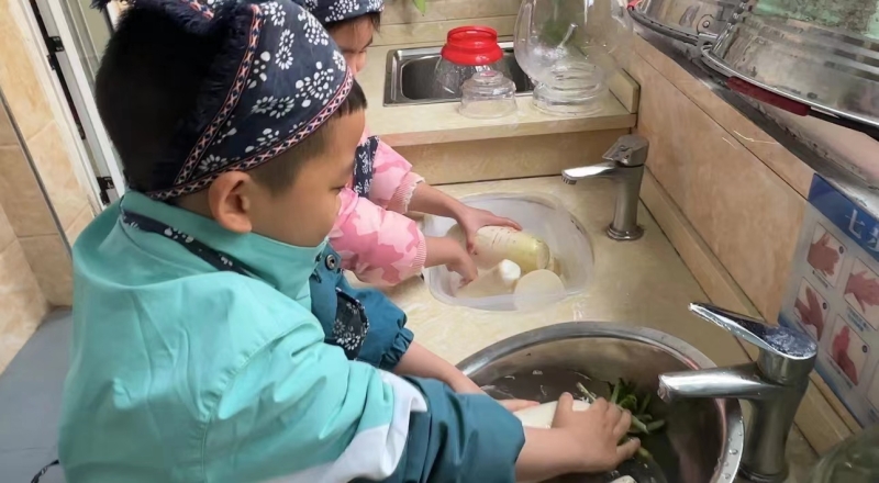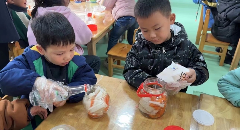 本网讯 12月4日,东坪镇闵家小精灵幼儿园结合生活课程理念开展“秋收冬藏,遇见泡菜”这一主题活动,让幼儿亲身感受冬季腌菜的乐趣和意义。 据悉,活动前期幼儿与家长一起收集腌菜所用到的东西,如萝卜、白菜、密封罐、醋等,大家乐不思蜀,积极行动;活动中各班老师带孩子们一起认识泡菜、了解泡菜、学习如何制作泡菜,重点向幼儿详细讲解了腌制泡菜的方法及步骤,然后分组开始操作;最后幼儿把腌制好的泡菜,放进了一坛坛罐子里,一瓶瓶新鲜出炉的泡菜制作完成,五彩缤纷的颜色真的让人好有食欲,孩子们抱着自己的泡菜瓶,满满的笑容和成就感。 该园园长戴欢妮表示:通过此次制作泡菜的实践活动,充分体现了我园让孩子在亲历中感受、在操作中体验的教育理念,同时闵幼孩子们通过亲自参与,享受劳动带来的快乐,也更深刻地体验到了中国传统饮食文化的魅力。(通讯员:戴欢妮 林志群 酉海花)