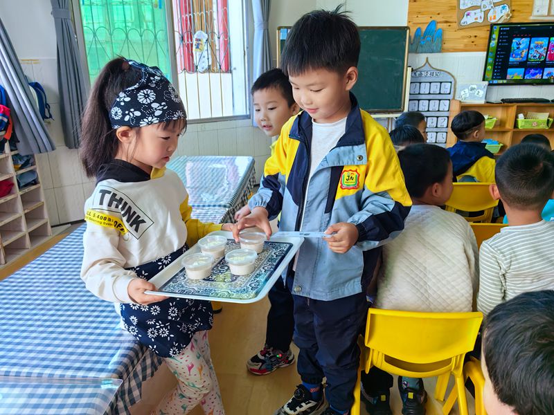 本网讯 11月9日,江南镇中心幼儿园大三班擂茶区域开展的有声有色,小朋友们分工合作,乐在其中。 一切准备就绪,小朋友们把花生米放进擂钵里,小心的用擂茶棍捣碎。过一会儿,又把熟花生米、生姜、茶叶擂一擂。最后的一道步骤,他们在老师的提醒下,小心的将开水冲进擂钵,再撒上美味的熟花生米、炒米和芝麻,香喷喷的擂茶出炉了。 卖擂茶了,小朋友们将擂茶一碗碗盛好,放在盘子里,大声吆喝:“好喝的擂茶一块钱一杯,快来买哟”“又香又甜的擂茶一块钱一杯,再不买就没有了。”擂茶很快卖完了,陈栢茹高举着游戏币说:老师,我赚到钱了,下次我还要打擂茶。” 打擂茶区域活动,结合小朋友已有的社会经验,锻炼了小朋友的动手能力和合作交往能力。(通讯员 张晓兰 徐慧)