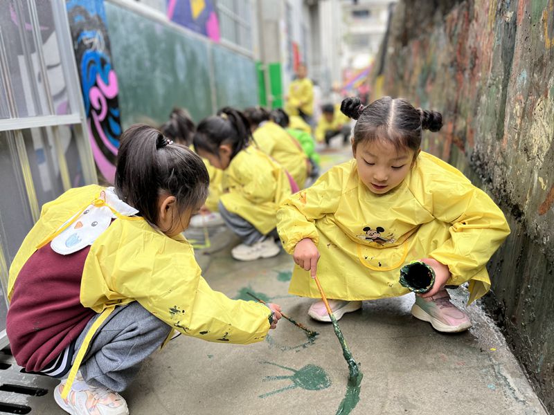 本网讯 10月27日,马路镇中心幼儿园开展“缤纷色彩,快乐涂鸦”户外自主游戏活动。 涂鸦是一种艺术表现形式,是打开心灵之窗的钥匙。对于幼儿园的孩子来说,涂鸦是一种轻松、愉快的游戏活动。 来到涂鸦区,孩子们把规划图画在小黑板上。面对着大大的涂鸦墙,已经迫不及待想去尝试了,他们对涂鸦的准备工作展开了探讨。组长魏子然对这次的涂鸦做了详细的分工:“小翊画火车轨道、小萱来画花草树、恩恩画房子、小雅画花、小溧画车、小然与小杰涂鸦。”小组长问:“任务清楚了吗?”大家回答:“清楚了!”然后只看见小朋友们纷纷用排笔蘸颜料、加水,将颜料调匀,带着期待开始创作之旅。