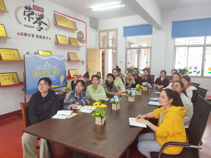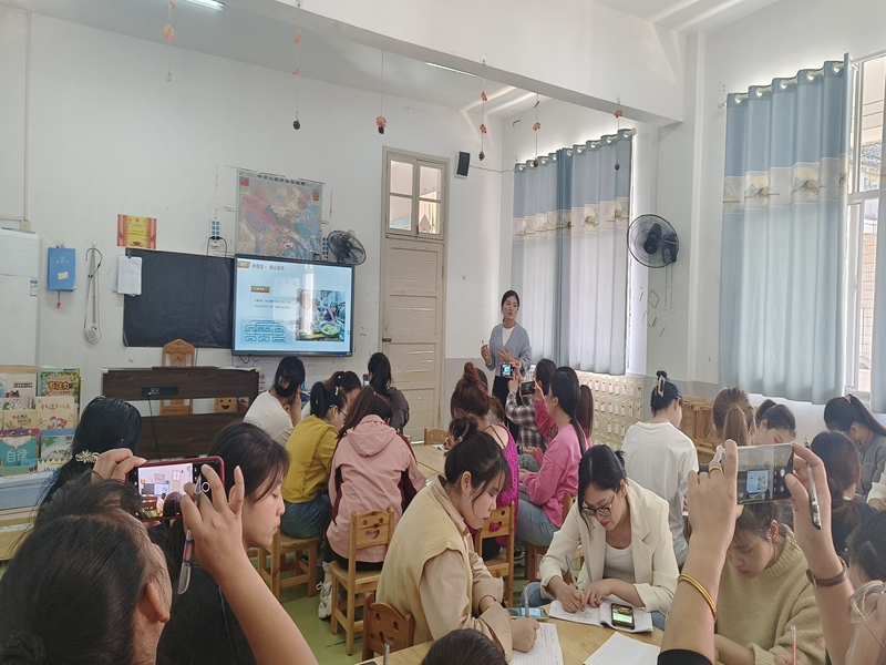 本网讯 近日,梅城镇中心幼儿园组织全园主要教师开展自主游戏材料研讨活动。 此次研讨分为集体研讨、小组研讨、现场学习和线上学习等,研讨内容丰富,形式多样。在现场研讨中,园长付蓉组织32位主配班教师开展题为《儿童视角下自主游戏材料投放》的研讨活动。她从什么是儿童视角、什么是儿童视角的材料投放,从源头上找到园所户外场地材料投放存在的问题等进行探讨,然后老师们根据园所实际,结合孩子的想法分组商讨沙水区、葡萄架下、中坪、内坪、顶坪等场地材料投放的改进策略,大家各抒己见,现场商讨气氛热烈,户外场地的材料投放改进方案也随之成型。 10月26日,湖南省幼儿园自主游戏活动典型优秀案例分享暨研讨活动在湖南大学幼儿园进行,上午场和下午场都有现场直播,该园把握这一难得的机会,组织老师们在四楼小会议室分批进行线上学习,聆听来自全省各市、州的20位教师分享她们的自主游戏案例以及专家点评。 各教师分别从游戏背景、游戏实录、游戏特点价值、下一步的思路通过文字、照片和视频等形式进行讲述,每一位老师认真观看,用心聆听,不时记录。
