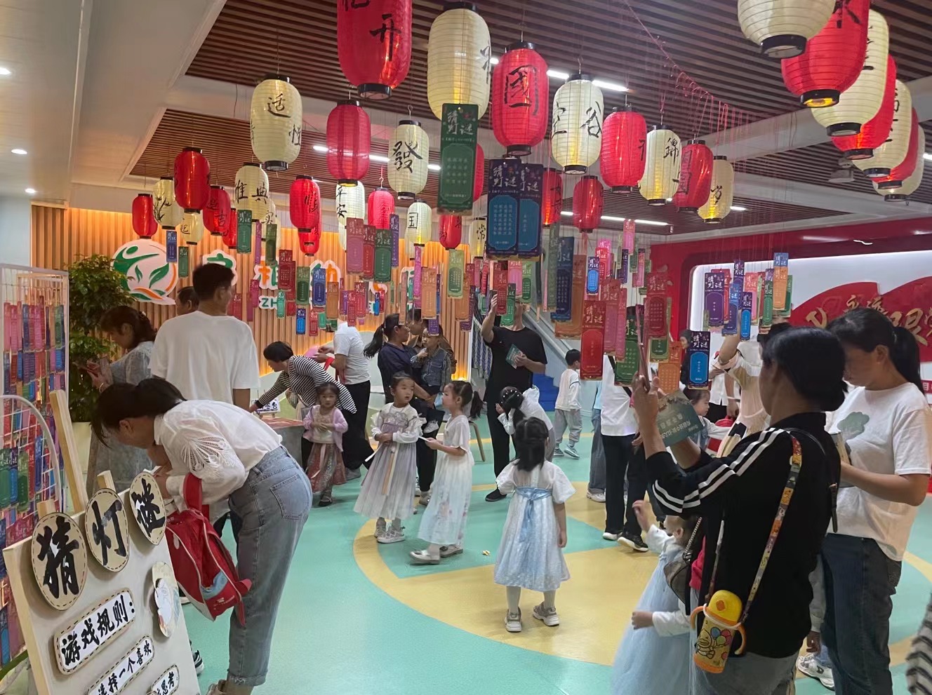 亲子携手,欢乐游园。拍照打卡区中,家长们纷纷拿出手机打卡发圈,感受浓情的节日气氛,定格亲子间的幸福时刻,并在祈愿墙上写下对祖国的美好祝福。其中,在“大兵小将、横渡赤水、重走长征路”等游戏互动区,家长出谋划策,孩子全力配合,以默契与鼓励冲破重重关卡,喜获通关印章。