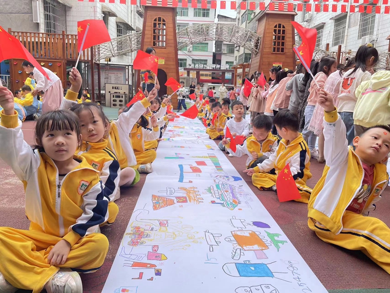 本网讯 9月25日至28日,梅城镇中心幼儿园集孩子们的想法和意愿,融合双重节日元素,开展了“月圆映中秋 童心庆国庆”为主题的迎中秋庆国庆系列活动。 25日,各班级根据孩子的年龄特点开展了形式各异的主题教育,孩子们了解了中秋节的传统文化,知晓了中秋节的习俗趣事;通过观看图片、视频,了解国庆的由来,感受祖国的地大物博,源远流长。学手指谣,唱红歌,进行快板表演,每个班级都充满了浓浓的节日氛围。 活动第二天,各班级组织孩子们进行与中秋、国庆有关的美术和手工创作活动。小班组利用橡皮泥、彩泥制作月饼;中班组利用爱心卡纸、水彩笔制作贺卡;大班组利用饮料瓶、彩纸、麻绳、装饰品等制作彩灯。幼儿园对孩子们的作品进行了展览。放眼中坪,月饼一个个有序摆放在桌子上;贺卡一张张挂在网格架上;一个个灯笼悬挂在葡萄架上,孩子们欢呼“这是我做的兔子灯笼,漂亮吧!”“我做的是草莓味的月饼!”“我做的贺卡是送给爷爷的……”孩子们相互欣赏着作品,高兴、惊喜、羡慕、好奇溢于言表,家长们也在孩子的作品前看了又看,并发表感慨:“这些孩子都做得好啊!”“好,有创意的!”脸上流露出赞许与幸福的表情。 第三天是“巧手绘中国”活动。活动现场,长长的画卷一字排开,小画家们或半蹲或半跪,在百米长卷上,用灵巧稚嫩的小手勾勒出一幅幅绚丽的图画,有的画国旗、有的画、有的画火箭、生日蛋糕经过一个多小时的认真描绘,百米画卷从白卷变成色彩斑斓的图画,一幅幅作品凝结了孩子们对祖国的热爱与赞美,每条线条都蕴藏着孩子们对祖国的点点心意。孩子们在老师的组织下或坐或站或举或围,与画卷合影,校园里一片温馨、祥和的氛围。 28日,活动最后一天,园所早早地为孩子们安排了有奖猜灯谜活动。稍后,四个小班组的孩子们手持爱心国旗,在老师的带领下开展了“我和国旗合个影”活动。中班组的孩子们化身小红军重走红军长征路,老师们提前用轮胎、梯子、绳网、地垫等户外游戏材料精心布置了重重关卡,小红军们相互协作,不怕困难,穿越火线、飞夺泸定桥、过雪山、溜滑道、炸碉堡、过草地,突破重重障碍,在四楼多媒体室取得了“胜利大会师”。大班组以班为单位开展打擂茶活动,孩子们分工合作,洗的洗、剥的剥、摘的摘、擂的擂……一会儿,擂茶的香味飘满了整个幼儿园,夹杂着甜甜的,幸福的味道。