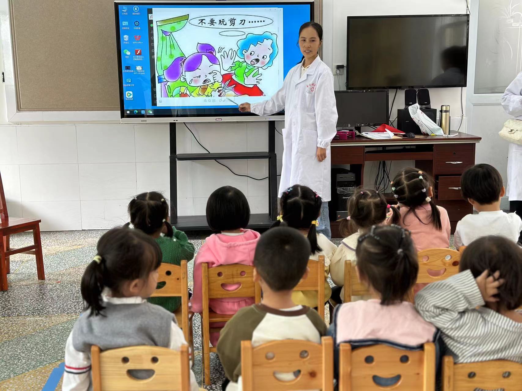 卫生院医生以绘本故事、PPT讲解的形式,生动地向小朋友们形象地讲述儿童意外伤害的知识,让小朋友们在轻松愉快的状态下,掌握自我保护知识。