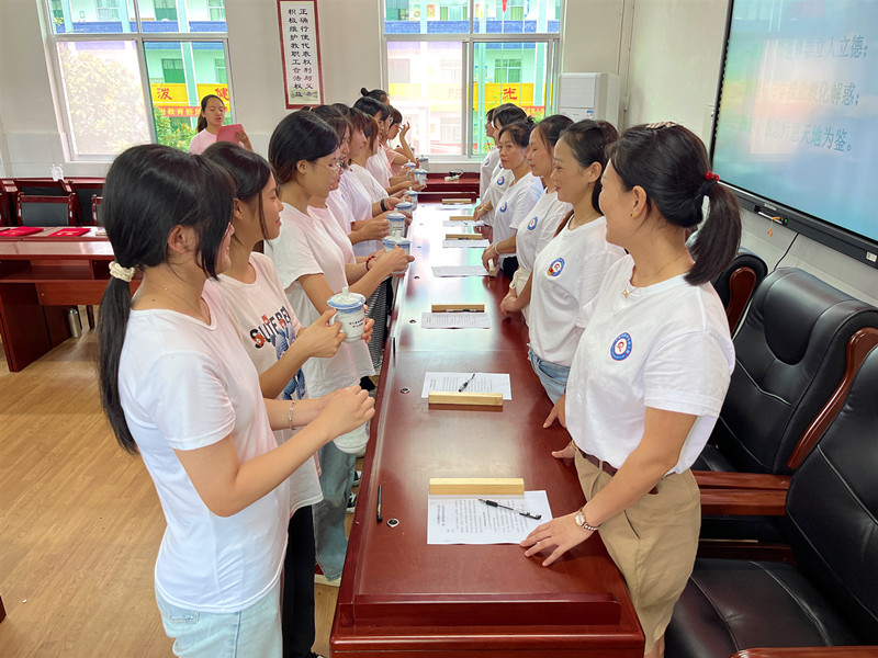 本网讯 9月20日,羊角塘镇中心幼儿园举行了以“青蓝结对,薪火相传”为主题的师徒结对仪式。 结对仪式上,该园副园长夏思宣读了此次师徒结对方案及师徒结对名单,明确师徒双方的职责、权利和义务,强调师徒双方在教学上要相互促进、相互提高。徒弟与师傅在全园教师的见证下签订了结对协议,园长贺林为师傅成员颁发聘书。师傅代表谌珊妮表示会尽力做到“知无不言,言无不尽”,同时吸取徒弟们的闪光点,师徒并进,取长补短,共同进步;徒弟代表夏巧琼表示将虚心向老教师请教,勤学多问,立志成为一名“立德树人”的好老师。 活动在拜师礼,敬茶中结束,一个深深的鞠躬,饱含着师徒之间深深的情谊,相信在师傅们的细心指导下,青年教师将会脱颖而出,青蓝同心,未来可期。