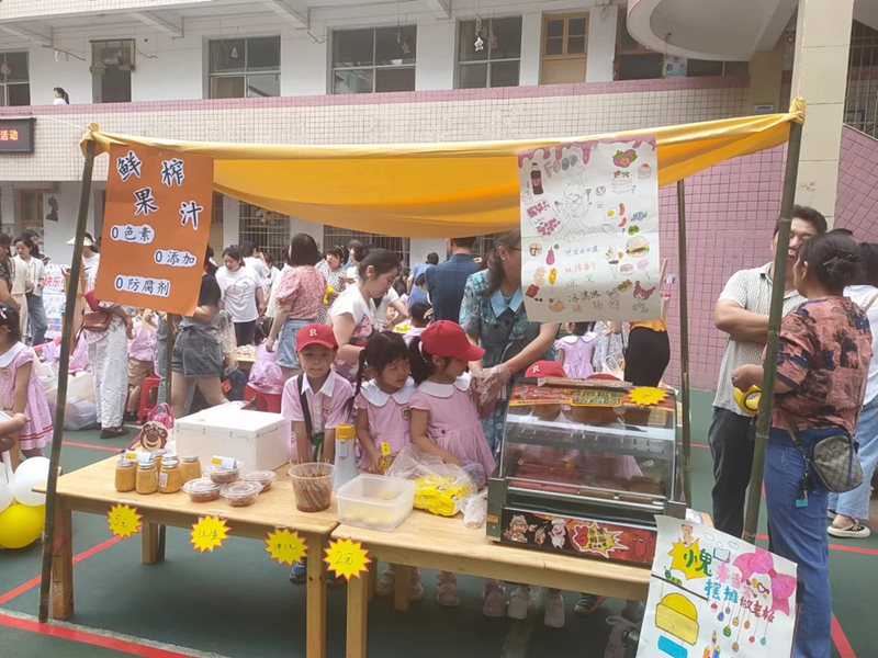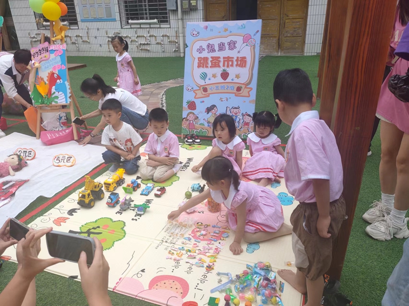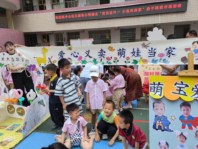 本网讯 “卖擂茶啦!卖擂茶啦!2元钱一杯”“卖书啦!快来买呀,不好看不要钱,买一送一。”……6月1日一大早,梅城镇中心幼儿园传出一阵阵稚嫩的吆喝声,该园“欢乐过六一 小鬼来当家”亲子跳蚤市场活动正在火热进行之中。 小班组的孩子们在中坪进行闲置玩具义卖,布娃娃、奥特曼、车子、泡泡机等各式玩具看得人眼花缭乱;中班组的孩子在内坪规定区域进行美食义卖,自制水果沙拉、凉面、粽子、粑粑、寿司等美食让人垂涎三尺;大班组的孩子则实现闲置资源循环利用,“旧书”遇“新主”,新的故事在这里拉开序幕! 据悉,本次庆“六一”活动内容是基于第十二个全国学前教育宣传月活动主题“倾听儿童,相伴成长”背景下,倾听孩子们的心声而确定的,整个活动由孩子们自己商讨、策划、筹备。本次跳蚤市场义卖所筹得款项将通过家委会捐赠给有需要帮助的本园孩子。