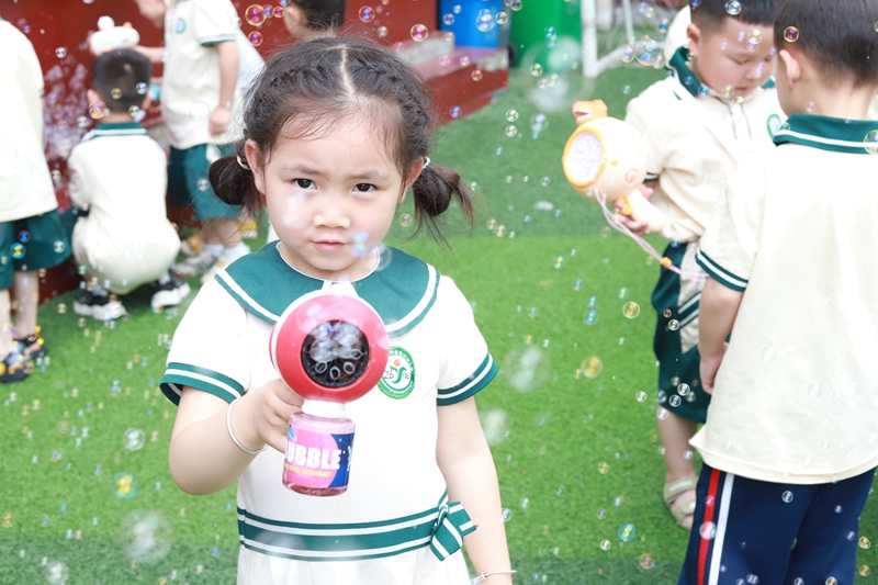 随着活动音乐的响起,在老师的组织下带领下,小朋友们带好自己的装备兴奋的涌入小操场,开启泡泡大作战游戏。五光十色的泡泡显得格外的梦幻和美丽。孩子们手持泡泡机与老师、同伴一起玩得不亦乐乎。泡泡飞得远,快乐传得远。孩子们置身于多姿多彩的泡泡中,触摸这些带着纯真与美好的泡泡,有一种幸福的味道在涌动。