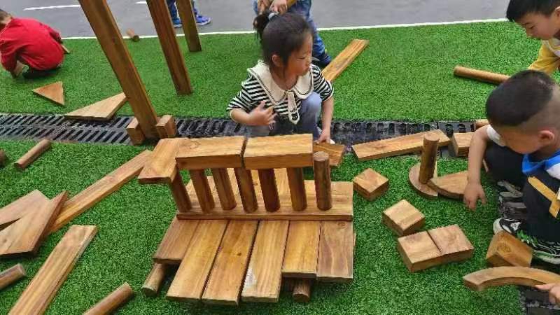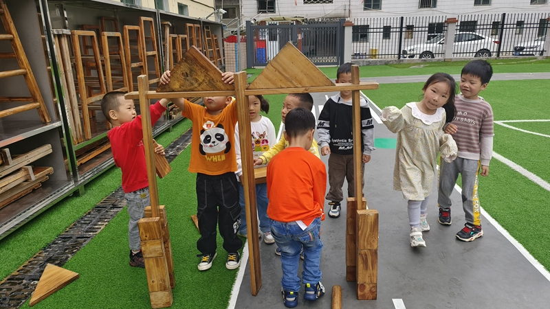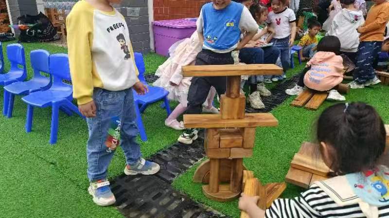 看,孩子们三个一群,五个一组,有的小朋友在认真观看图纸,有的小朋友在摆弄着手中的材料,好像在思索着什么?有的小朋友则和同伴商量着拼接的方法,孩子们尽情地发挥着自己的创造力和搭建技巧,一件件形状各异的材料在孩子们的奇思妙想中焕发出勃勃生机。