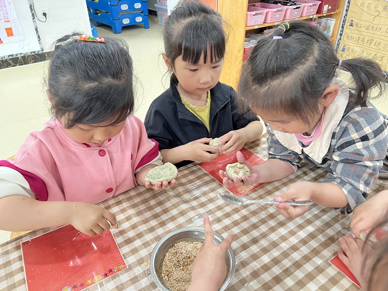 老师通过图片、视频、以及简单的文字让孩子们了解立夏这个节气,介绍各地立夏节日习俗。各班开始进入制作环节,老师将糯米粉、粘米粉加温水拌和并加入水肉子搅匀后,孩子们就开始“捏一捏、搓一搓、揉一揉”圆圆的立夏坨子就做好啦,孩子们做的不亦乐乎。当孩子们尝到自己亲手制作的立夏坨之后脸上的笑容更加灿烂了,个个都说自己做的立夏坨最好吃。
