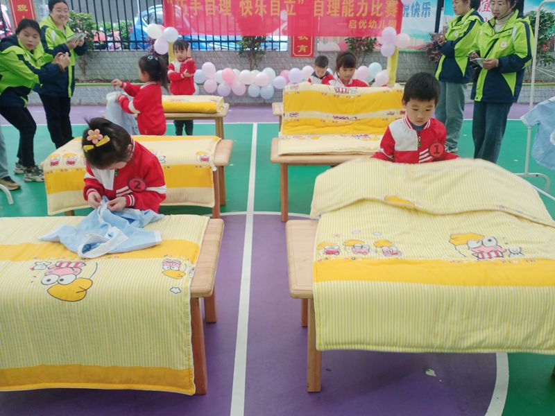 该园根据孩子的年龄特点,合理的安排活动内容,小班穿衣服、穿袜子、穿鞋子,中班扣扣子、晾衣服、叠被子,大班系鞋带、整理书包,在欢快的音乐伴奏下,孩子们比拼得热火朝天,啦啦队的加油声更是此起彼伏,每个人都沉浸在这紧张的比赛氛围中。孩子们在活动中得到了锻炼,掌握了生活小技巧,提高了生活自理能力。