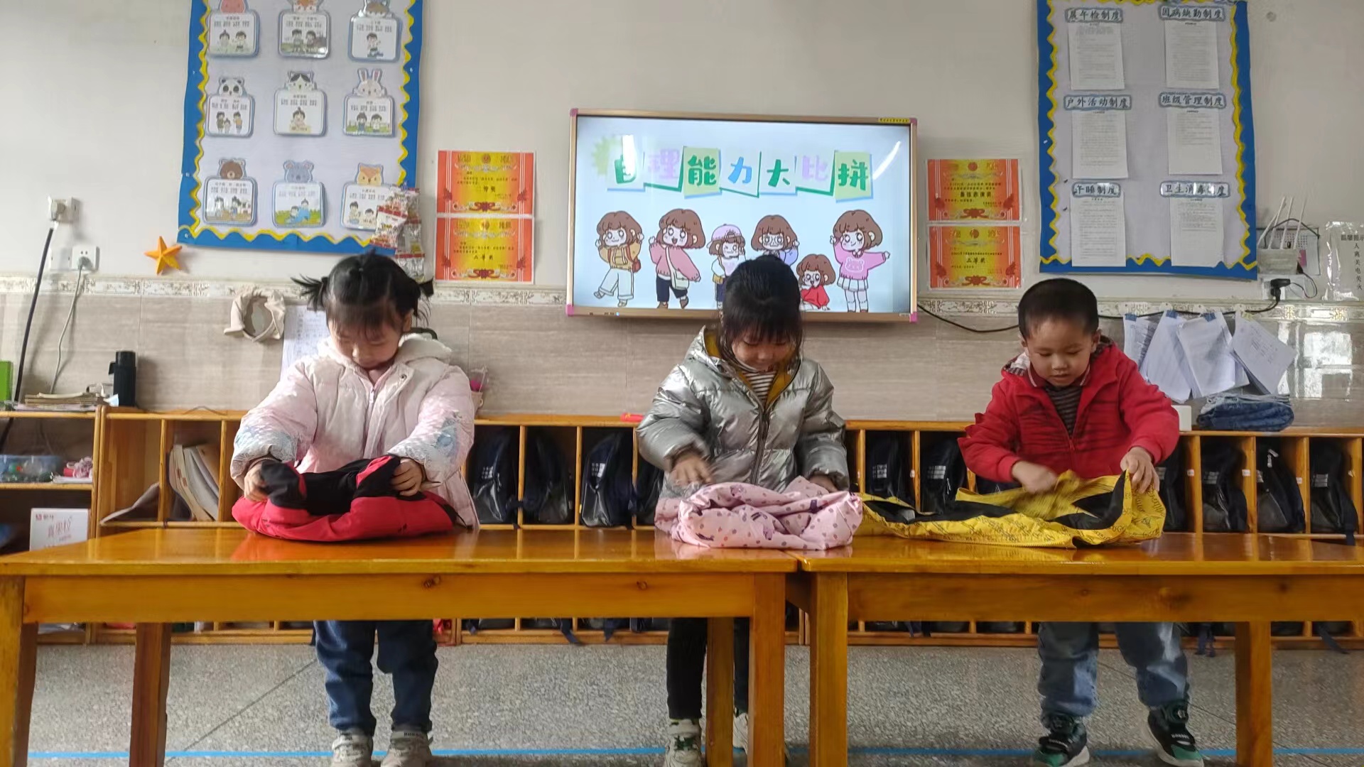 比赛分为三个项目:穿鞋子、叠衣服、叠裤子。在比赛活动中有的孩子动作娴熟,能快速地完成比赛任务;在叠衣服的过程中,小朋友的嘴里念着朗朗上口的歌谣:小衣服 放放好;我来把你叠叠好;左右小门关一关;两只小手抱一抱;我们一起弯弯腰;我的衣服叠叠好。