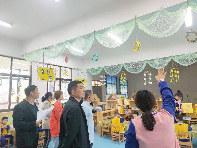 本次区域环境创设采取打分制,由园长朱会平担任组长,南金中心领导为评委进行打分,主要通过“教师解说+整体环境+主题环境+区域创设”等方面进行观摩。各班教师担任讲解,全面细致地介绍班级区域创设、材料投放等方面的创设思路和教育价值。