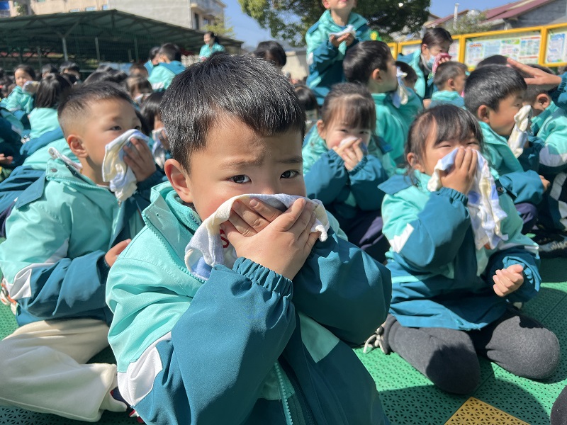伴随着紧急警报声响起,演练开始。各班教师迅速按消防预案的疏散线路,有序带领幼儿拿起湿毛巾,捂住口鼻,弯腰小步快走,迅速且有序下楼。途中,孩子们冷静、有序、快速撤离。撤离到安全区域后,各班教师迅速清点人数,并向总指挥报告。此次演练从警报声拉响到全园安全撤离到操场仅用时2分30秒。